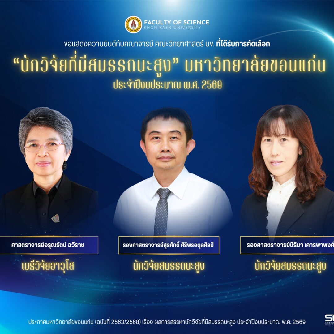 ขอแสดงความยินดีกับคณาจารย์ผู้ทรงคุณวุฒิ ที่ได้รับการคัดเลือกให้เป็น “นักวิจัยที่มีสมรรถนะสูง” มหาวิทยาลัยขอนแก่น ประจำปีงบประมาณ พ.ศ. 2569