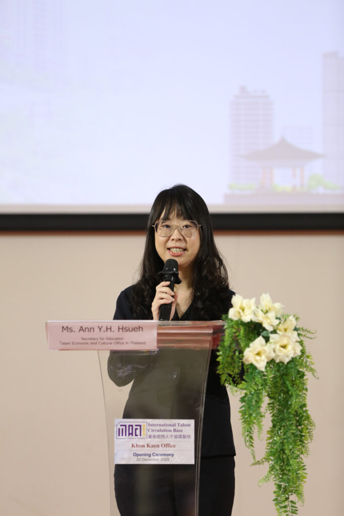 และในลำดับสุดท้าย Ms. Ann Hsueh ได้ให้เกียรติกล่าวถึงความสำคัญของศูนย์ความร่วมมือฯ INTACT Base ขอนแก่นว่า “การเปิดตัวศูนย์ที่ขอนแก่นในครั้งนี้ ถือเป็นการขยายฐานการให้บริการสู่ภาคตะวันออกเฉียงเหนืออย่างสมบูรณ์ ซึ่งถือเป็นศูนย์ที่สาม ภายหลังการจัดตั้งศูนย์แห่งแรกในกรุงเทพมหานคร และแห่งที่สองในจังหวัดเชียงใหม่” พร้อมทั้งเน้นย้ำวิสัยทัศน์ในอนาคตว่า “ไต้หวันพร้อมขยายความร่วมมือกับมหาวิทยาลัยในประเทศไทยเพิ่มเติม ทั้งในด้านหลักสูตรปริญญาร่วม การแลกเปลี่ยนนักศึกษา และโครงการวิจัยร่วม เพื่อสร้างโอกาสใหม่ในการพัฒนาทรัพยากรมนุษย์และความสัมพันธ์ในระดับประชาชนอย่างยั่งยืน”