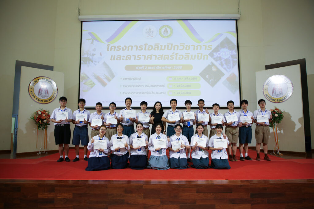 วันที่ 25 มีนาคม 2569 เวลา 13.00 น-14.00 น. คณะวิทยาศาสตร์ มหาวิทยาลัยขอนแก่น จัดพิธีปิด”ค่ายโอลิมปิกวิชาการและดาราศาสตร์โอลิมปิก ค่าย 2 ประจำปีการศึกษา 2568″ สาขาวิชาดาราศาสตร์ ระดับมัธยมศึกษาตอนต้นและมัธยมศึกษาตอนปลาย และพิธีมอบเกียรติบัตร ให้แก่นักเรียนผู้เข้าร่วมโครงการ ณ ห้องวิทยวิภาส 1 อาคารวิทยวิภาส โดยมี รศ. ดร.ศุจีภรณ์ อธิบาย ผู้ช่วยคณบดีฝ่ายการศึกษาและบริการวิชาการ ให้เกียรติเป็นประธานในพิธีปิด มีคณะผู้บริหาร คณาจารย์ บุคลากร และผู้ปกครองเข้าร่วมแสดงความยินดีกับเหล่านักเรียนที่ผ่านการฝึกอบรมอย่างมุ่งมั่นตลอด 19 วันเต็ม (ตั้งแต่วันที่ 7 – 25 มีนาคม 2569) เพื่อพัฒนาศักยภาพทางวิชาการ เสริมสร้างประสบการณ์ และ คัดเลือกตัวแทนที่จะเข้าร่วมการแข่งขันในระดับชาติต่อไป