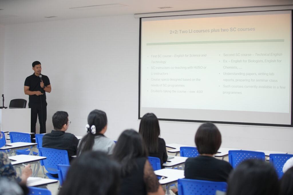 อ. ดร.สุขุม เรืองไชย ผู้ช่วยคณบดีฝ่ายวิเทศสัมพันธ์และสื่อสารองค์กร ได้นำเสนอโครงการ “To Be a B2 Scientist” ที่มุ่งพัฒนาทักษะภาษาอังกฤษของนักศึกษาให้บรรลุระดับ B2 ทั้งเชิงวิชาการและเฉพาะทาง พร้อมรูปแบบการจัดการเรียนการสอนที่ยืดหยุ่น และกิจกรรมเสริมต่างๆ เช่น SCiKKU Speaks English Day และโครงการเตรียมความพร้อม KEPT