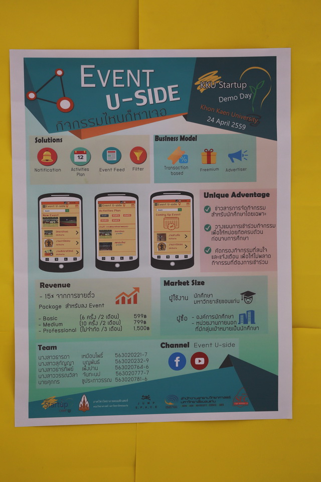 กิจกรรม “Pitching & Demo Day” ในวันที่ 24 เมษายน 2559 ณ ห้องประชุมวิทยาลัยการปกครองท้องถิ่น มหาวิทยาลัยขอนแก่น ได้รับเกียรติจาก ศ.ดร.ศุภชัย ปทุมนากุล รองอธิการบดีฝ่ายวิจัยและถ่ายทอดเทคโนโลยี มหาวิทยาลัยขอนแก่น เป็นประธานเปิดงานฯ มี ผศ.ดร.สมเกียรติ ศรีจารนัย คณบดีคณะวิทยาศาสตร์ มหาวิทยาลัยขอนแก่น ดร.คมเมธ จิตวานิชไพบูลย์ ผู้จัดการโครงการอาวุโส สำนักงานคณะกรรมการนโยบายวิทยาศาสตร์ เทคโนโลยีและนวัตกรรมแห่งชาติ และผู้มีเกียรติทั้งภาครัฐและเอกชนอีกหลายท่าน ร่วมงานฯ