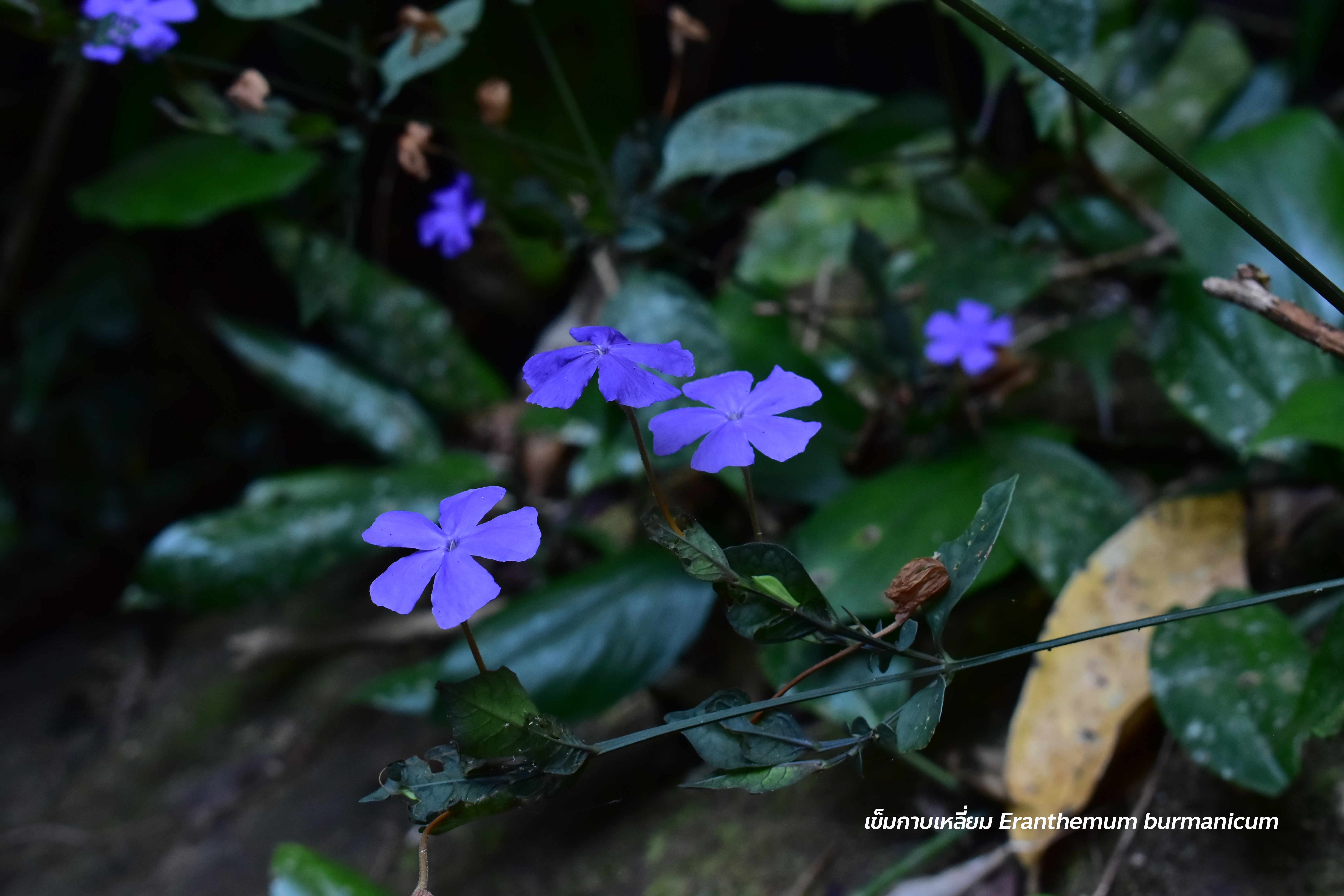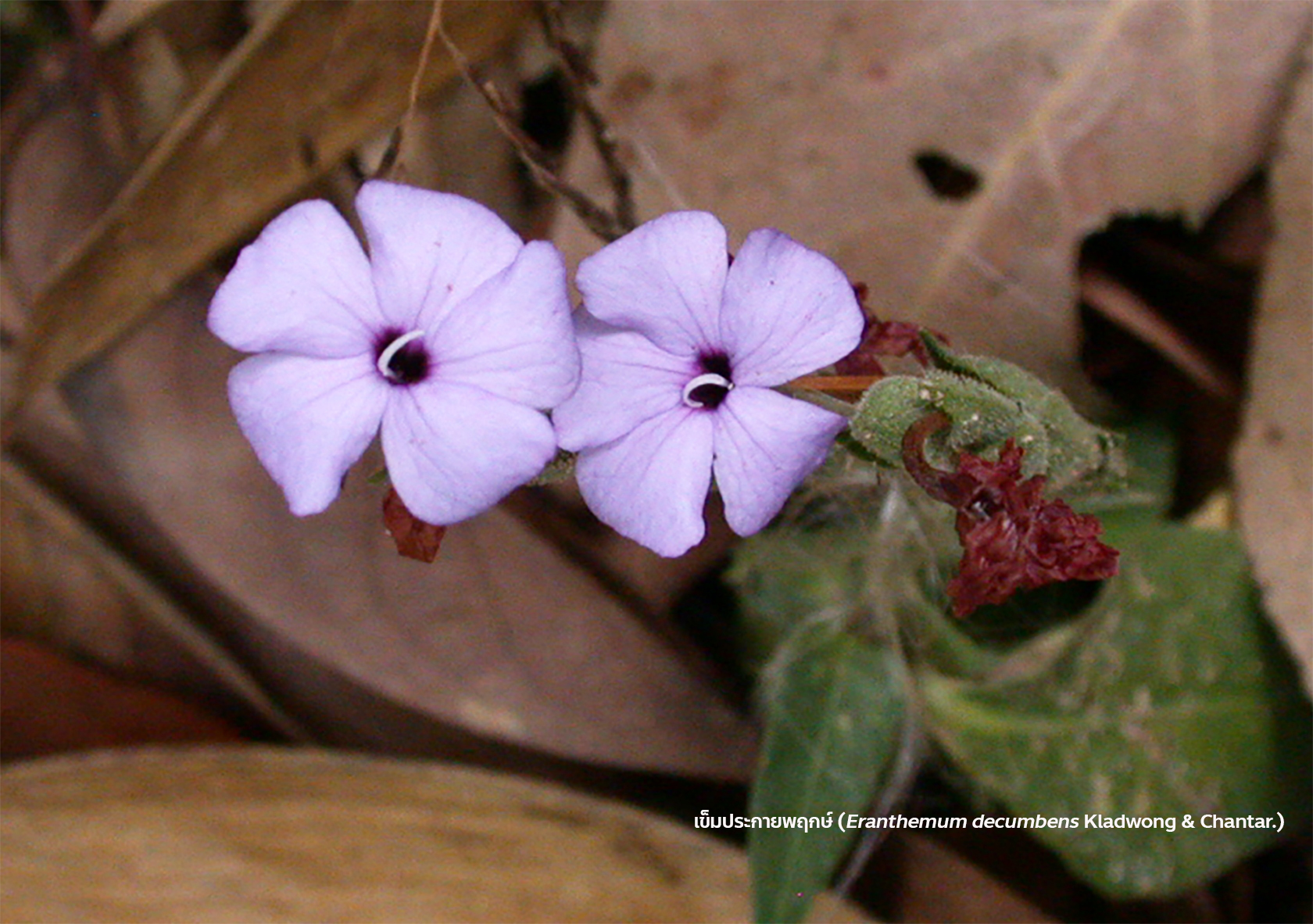 ข. เข็มประกายพฤกษ์ (Eranthemum decumbens Kladwong & Chantar.) เป็นพืชในวงศ์ฟ้าทะลายโจร พบที่ จ.สุรินทร์ โดยตัวอย่างหมายเลข Kerr 8249 ซึ่งเก็บในปี ค.ศ. 1924 เป็นตัวอย่างต้นแบบแรก เก็บรักษาไว้ที่พิพิธภัณฑ์พืชกรุงเทพฯ (BK) พืชชนิดนี้มีลักษณะใกล้เคียงกับพืชจากอินเดีย ได้แก่ E. strictum Roxb. และ E. roseum Roemer & Schultes แต่แตกต่างกันที่เข็มประกายพฤกษ์ มีลำต้นทอดนอนไปตามพื้นและชูส่วนปลายขึ้น ใบรูปขอบขนานแกมรูปไข่ โคนใบรูปลิ่มหรือกลม ปลายใบแหลมหรือสอบเรียว ใบประดับย่อยและกลีบเลี้ยง รูปใบหอกแกมรูปไข่ พืชนี้มีการแพร่กระจายพันธุ์ในไทยและลาว