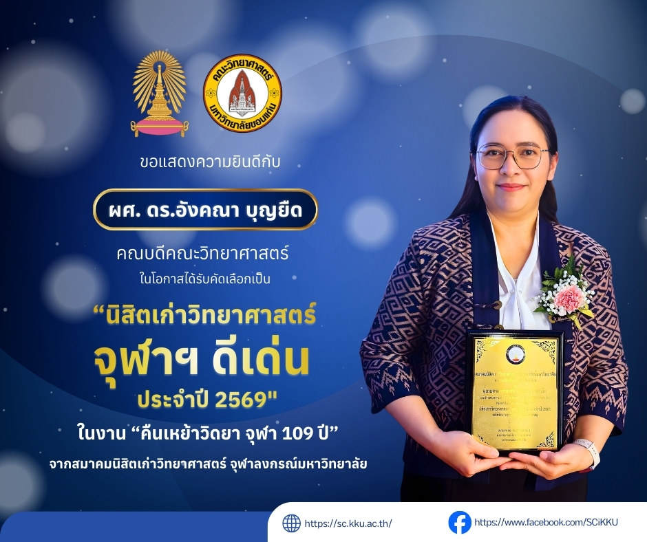 คณะวิทยาศาสตร์ มหาวิทยาลัยขอนแก่น ขอแสดงความยินดีกับ ผศ. ดร.อังคณา บุญยืด คณบดีคณะวิทยาศาสตร์ มข. ในโอกาสที่ได้รับเลือกเป็น “นิสิตเก่าวิทยาศาสตร์ จุฬาฯ ดีเด่น ประจำปี 2569” โดยเข้ารับรางวัลในงาน “คืนเหย้าวิดยา จุฬาฯ 109 ปี” จัดโดยสมาคมนิสิตเก่าวิทยาศาสตร์ จุฬาลงกรณ์มหาวิทยาลัย เมื่อวันที่ 21 กุมภาพันธ์ 2569 ณ คณะวิทยาศาสตร์ จุฬาลงกรณ์มหาวิทยาลัย