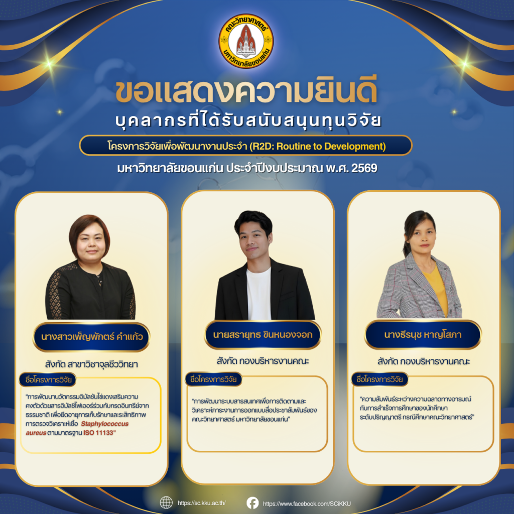 คณะวิทยาศาสตร์ มหาวิทยาลัยขอนแก่น ขอแสดงความยินดีกับบุคลากรประเภทสนับสนุน ที่ได้รับการคัดเลือกให้ได้รับสนับสนุนทุนวิจัย ตามโครงการวิจัยเพื่อพัฒนางานประจำ (R2D: Routine to Development) มหาวิทยาลัยขอนแก่น ประจำปีงบประมาณ พ.ศ. 2569 ได้แก่