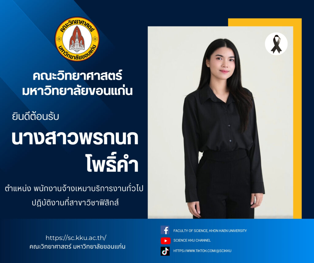 นางสาวพรกนก โพธิ์คำ บุคลากรประเภทสนับสนุน ตำแหน่ง พนักงานจ้างเหมาบริการงานทั่วไป ปฏิบัติงานที่ สาขาวิชาฟิสิกส์ ขอให้การเริ่มต้นการทำงานครั้งนี้เต็มไปด้วยความสุข ความสำเร็จ และแรงบันดาลใจ ร่วมเป็นส่วนหนึ่งในการขับเคลื่อนและพัฒนาคณะวิทยาศาสตร์ไปด้วยกัน